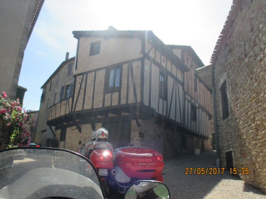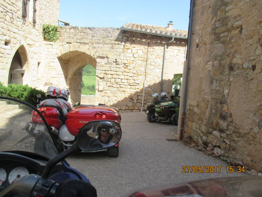 Samedi, un petit déj' matinale, nous rejoignent Jean en Zeus et deux solos, Lydie et Didier et un autre motard (j'ai mangé son prénom- C'est la chaleur ...) assurant la sécurité d'un convoi de 11 zeus, 1 méga légende, 1 BM attelée à un triton, pour nous faire découvrir les routes sinueuses de la Forêt de Grésigne traversant les magnifiques villages.